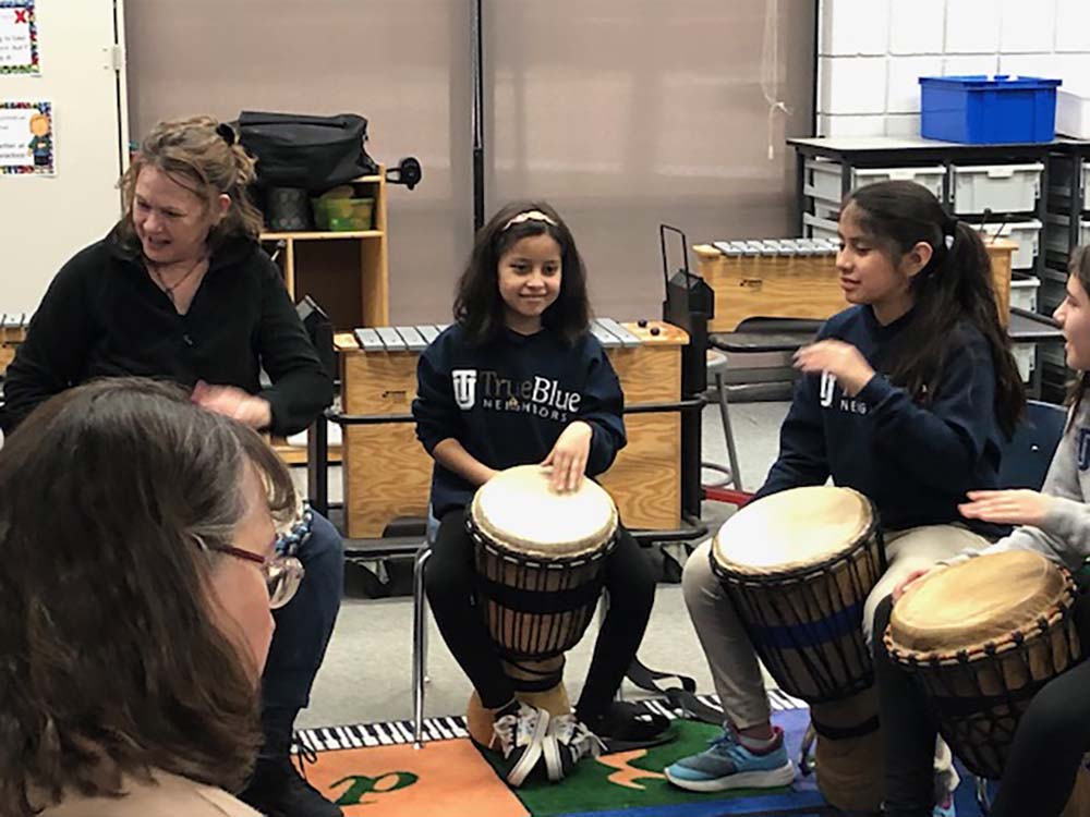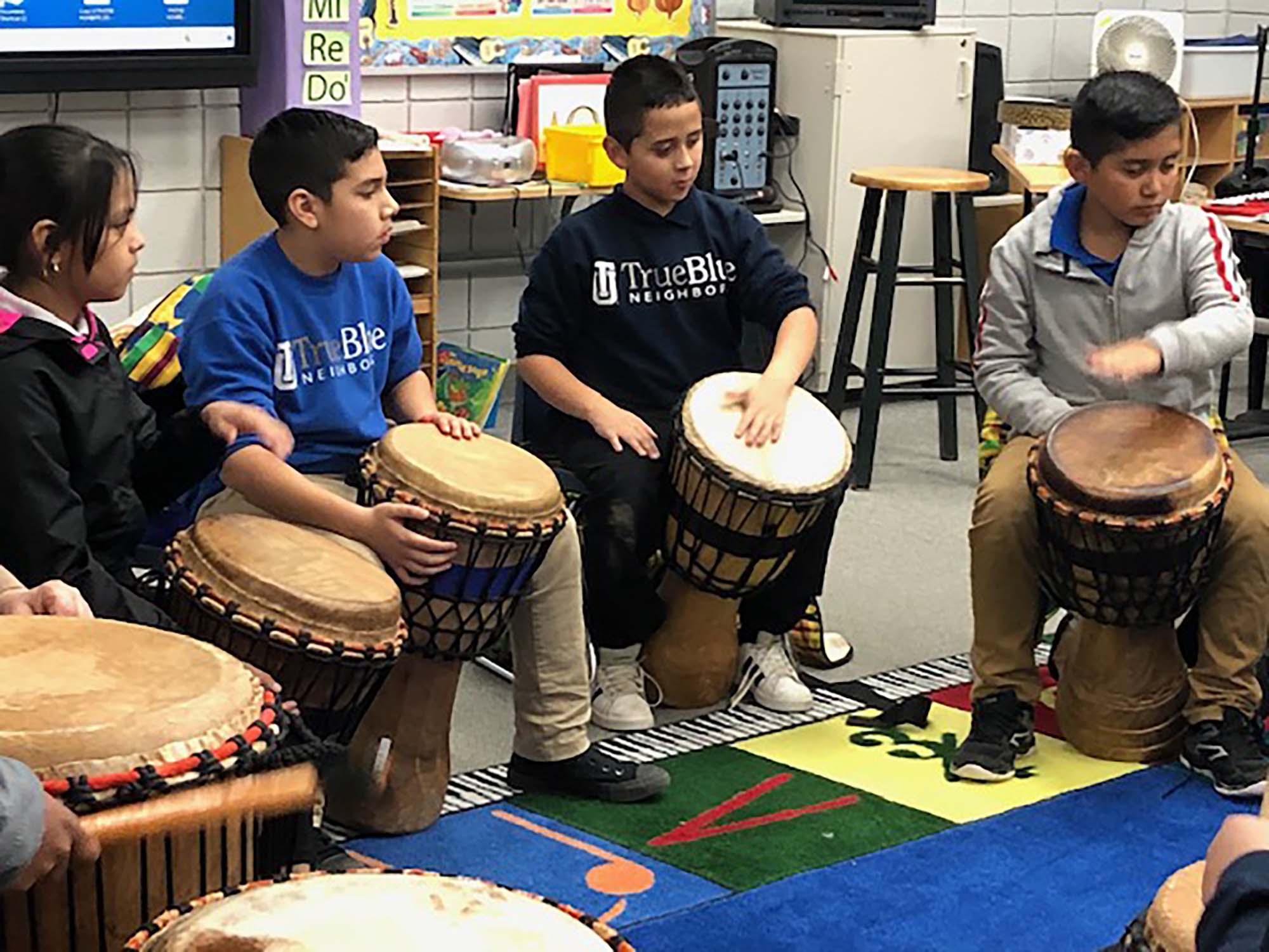 In partnership with Tulsa Public Schools, The bART Center for Music is entering it’s 20th year offering African Drumming two times weekly after school at Kendall Whittier Elementary School. Led by bART teaching artist Leslie Brown, each participant engages with percussion instruments (djembes or djun-djuns) and works toward public performances that occur during the middle and end of the program. Rhythms are drawn from the drumming cultures of Africa and South America, with percussion techniques utilized including hand techniques from West Africa,The National Republic of the Congo and South America. Resource material is drawn from the oral tradition and also taught authentically using that tradition. Every class time includes a beat, a variety of rhythms, polyrhythms, terminology such as pitch, dynamics, tone color, and tempo.